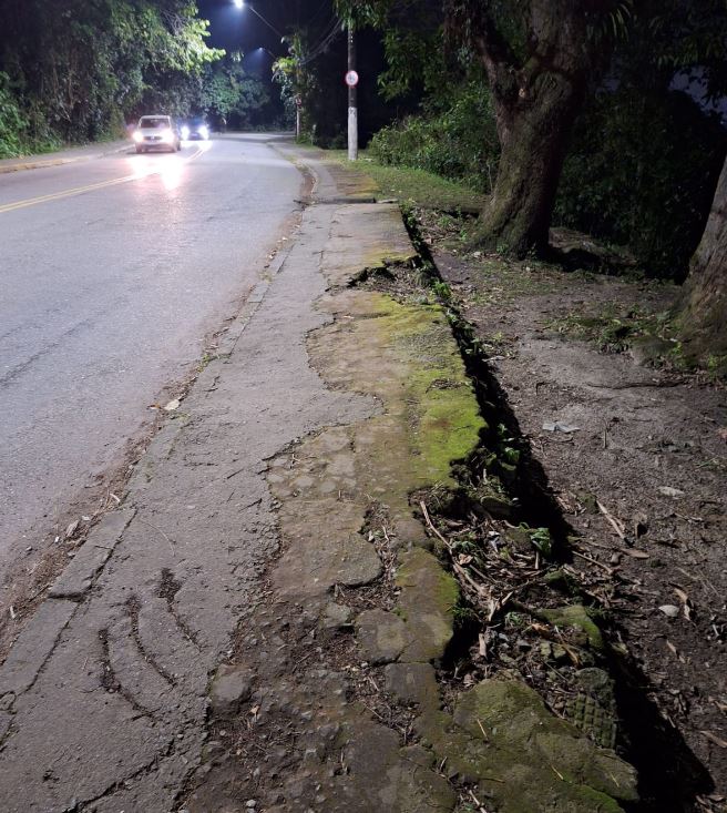 Um trecho em total abandono, a calçada da Av. Tupiniquins, Japuí em São Vicente deixa os municipes que por ali passam em total perigo. Calçadas quebradas, má iluminação e em dia de chuvas ficam piores. Hoje (14-08) iniciou a demolição da base politicial ao lado da Ponte Pencil, aumentando ainda mais o risco de assaltos.