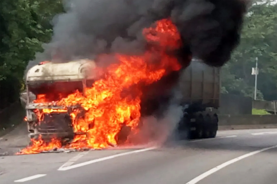 Neste domingo (19), um caminhão que transportava 30 toneladas de soja pegou fogo no quilômetro 49 da rodovia Anchieta, próximo a Cubatão.