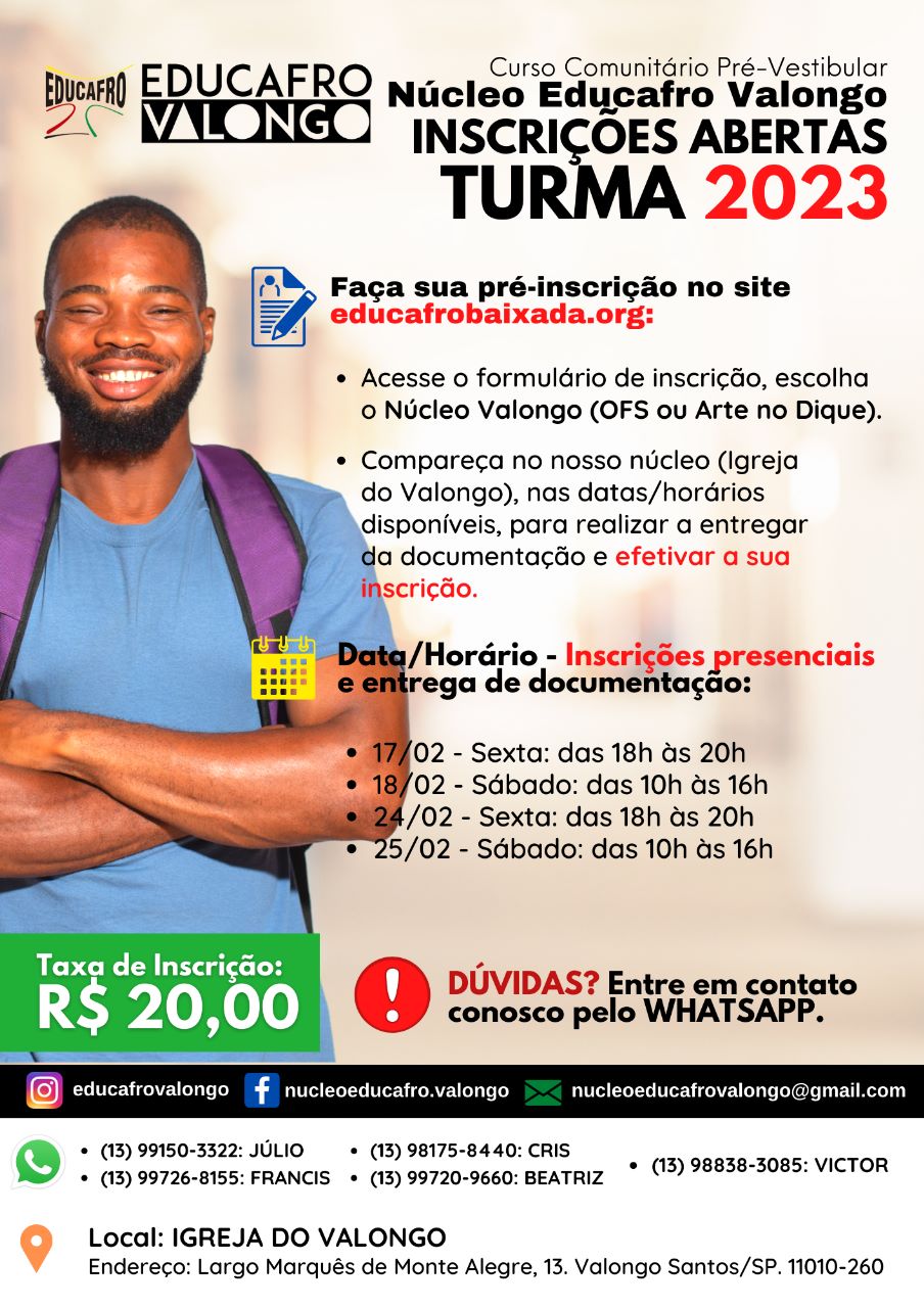 O Projeto EDUCAFRO – Educação e Cidadania de Afrodescendentes e carentes, curso pré-vestibular comunitário para negros e carentes, Núcleo Santos Valongo abre inscrições presenciais para formação da sua 23ª turma até o próximo dia 25/02.
