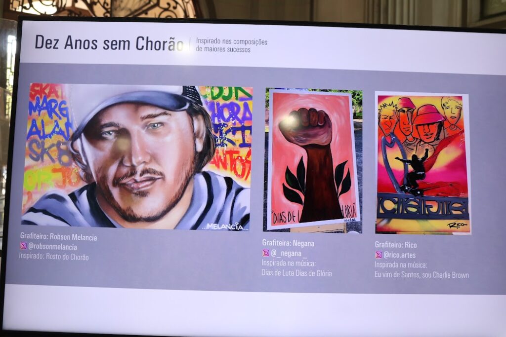 Assim como “os caras do Charlie Brown Jr. invadiram a Cidade”, uma homenagem à vida e obra de um dos maiores expoentes da música de Santos invadiu o Paço Municipal. ‘Dez Anos Sem Chorão’, exposição no estilo grafite em tela que presta homenagem ao cantor, foi aberta na tarde de segunda-feira (20), no Palácio José Bonifácio (Praça Mauá, Centro Histórico).