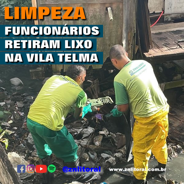 Funcionários da prefeitura regional da ZN esta realizando limpeza em baixo das palafitas na Vila Telma. Os lixos, restos de madeira, garrafas pet e até marmitas são retiradas em grande quantidade. Essa ação da regional é frequente, e caso esse serviço não for realizado, alagamentos irão aumentar no bairro do Rádio Clube, e principalmente a Vila Telma. É necessário que as pessoas tenham a consciêntização de recolher o lixo e jogar próximo do horário da coleta de sua região, evitando que se espalhe pelas ruas do seu bairro.