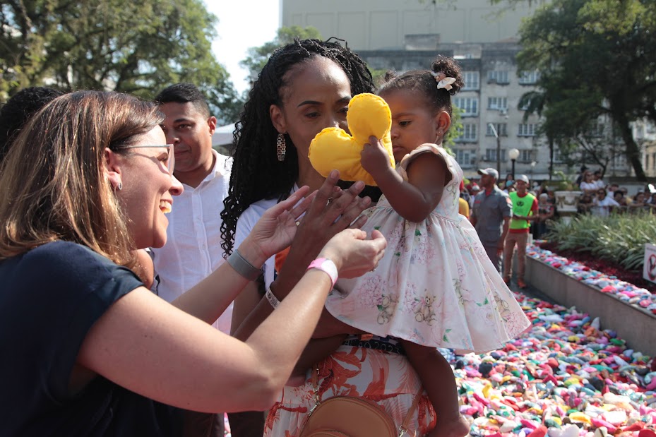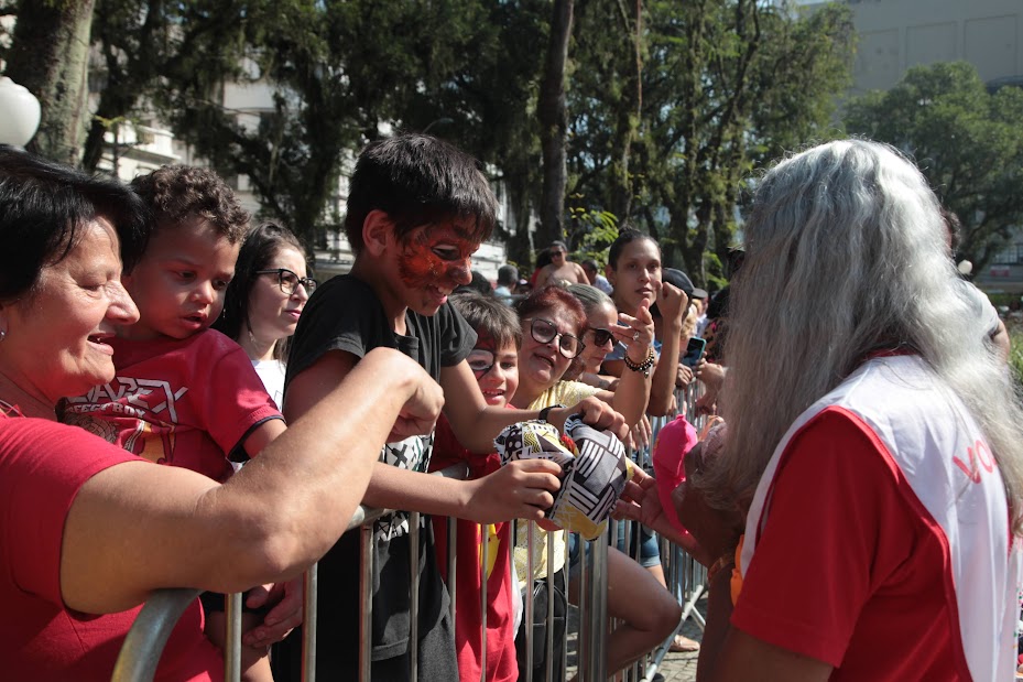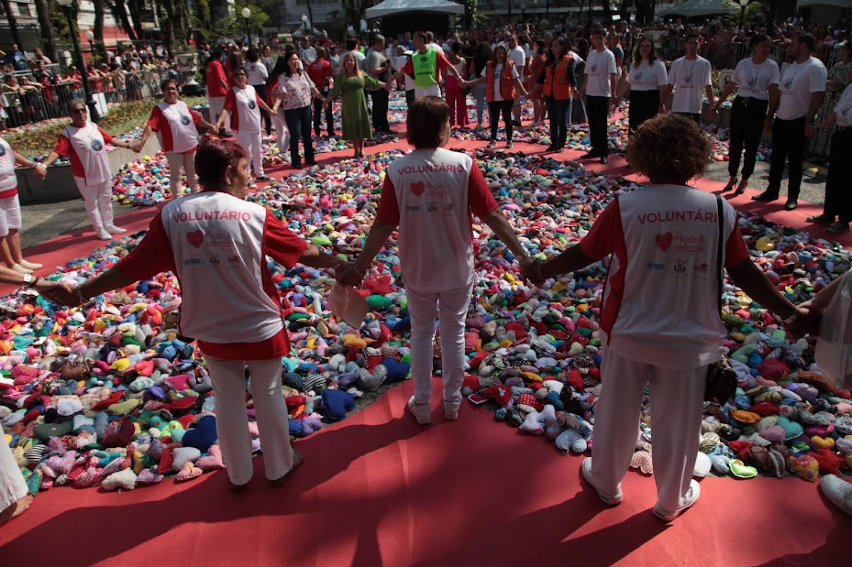 Após um abraço coletivo comandado por Alexandre Camilo, os corações confeccionados ao longo de meses espalhados no chão da praça foram, enfim, distribuídos aos presentes.