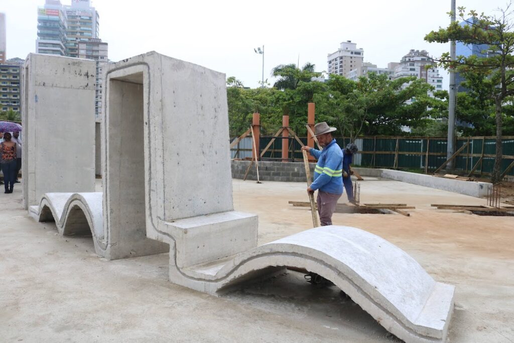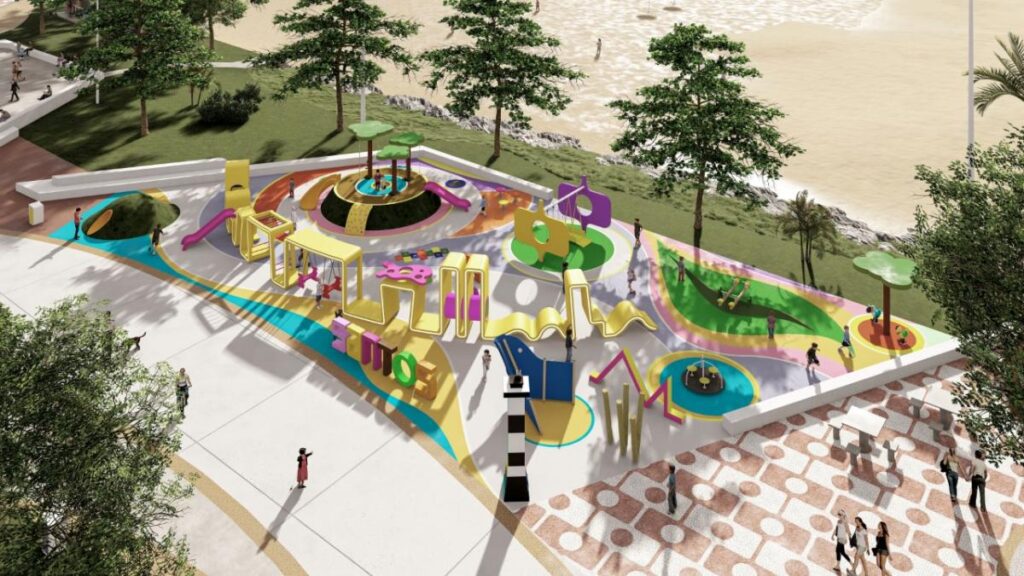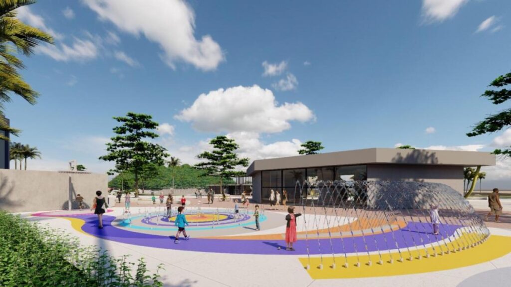 A criançada vai poder curtir o parque das águas, com equipamento instagramável e o playground, que terá equipamentos temáticos referentes a pontos turísticos e marcas de Santos, como brinquedos em forma de morros, de farol, de navio recreio e até dos prédios tortos.