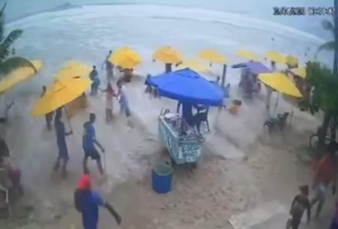 Ressaca atinge Praia da Enseada e “atropela” funcionários de barraca e banhistas que estavam na faixa de areia.