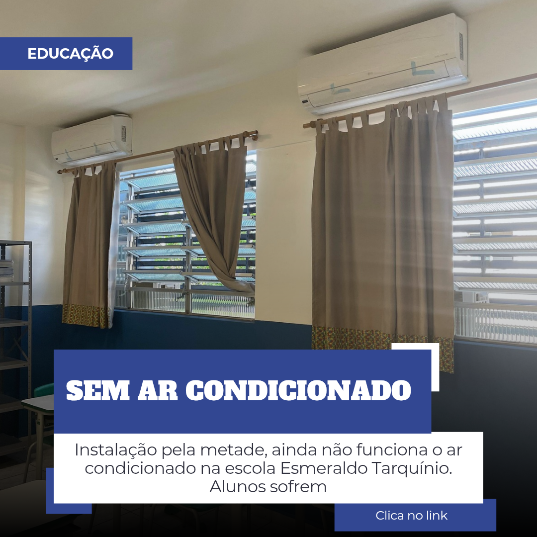 “Dessa vez só deu tempo de instalar o ar! Como todo ano de eleição prometeram e como não deu tempo fizeram o trabalho pela metade, instalaram ar condicionado em todas as salas do Escola Esmeraldo Tarquinio mais não há poste para ser ligado! Ar condicionado se tornou necessidade nessas classes quentes que ficam nossos filhos, e é uma lástima não ligaram porque a prefeitura enrola pra fazer a instalação do poste. As aulas iram começar na segunda feira e quem estava na reunião agora de manhã sentiu o abafado nas classes!! Alô vereadores que fizeram passeatas na Avenida Álvaro Guimarães, cadê vocês?? Sumiram ???”. Diz nossa seguidora.